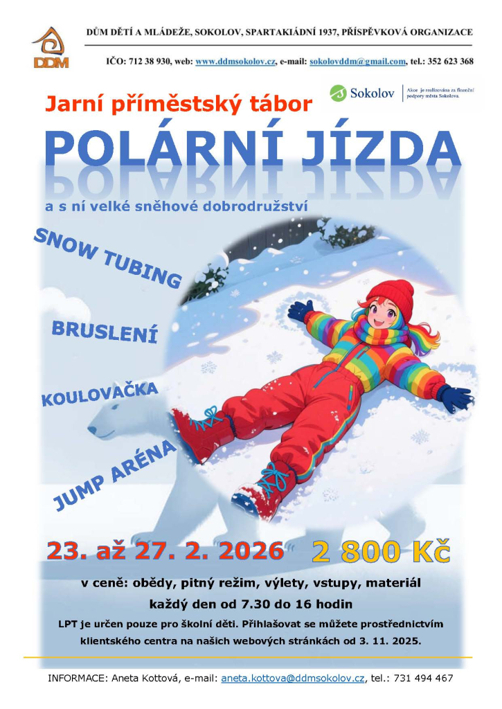 Děti se během jarních prázdnin v DDM mohou těšit na pestrý program se zimními, sportovními a adrenalinovými aktivitami. Společný čas strávíme nejen v areálu DDM, ale i na výletech. Děti čeká snow tubing na zasněžených svazích, soutěže v jump aréně a spoustu dalšího.
